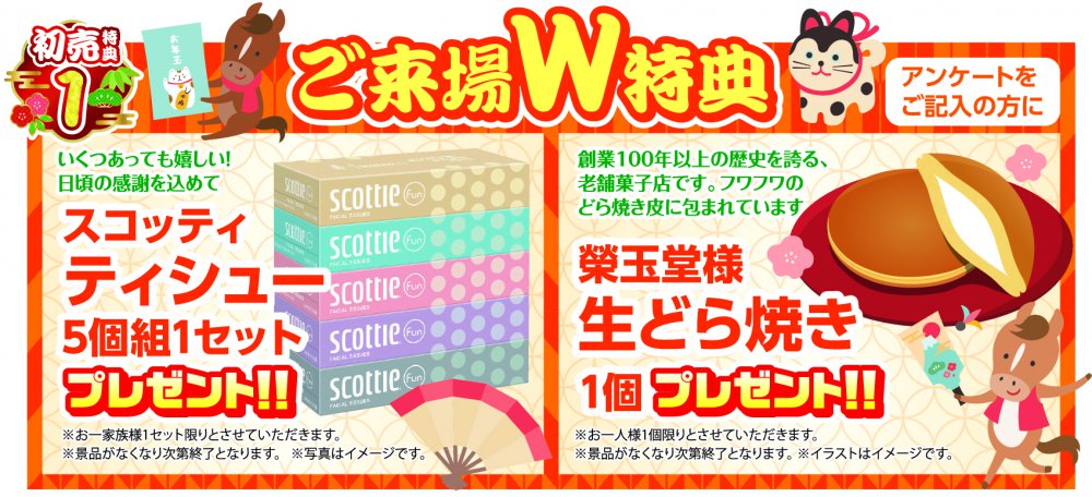 特典1 ご来場W特典 アンケートをご記入の方に スコッティティッシュー5個組1セット&榮玉堂様「生どら焼き」1個プレゼント!