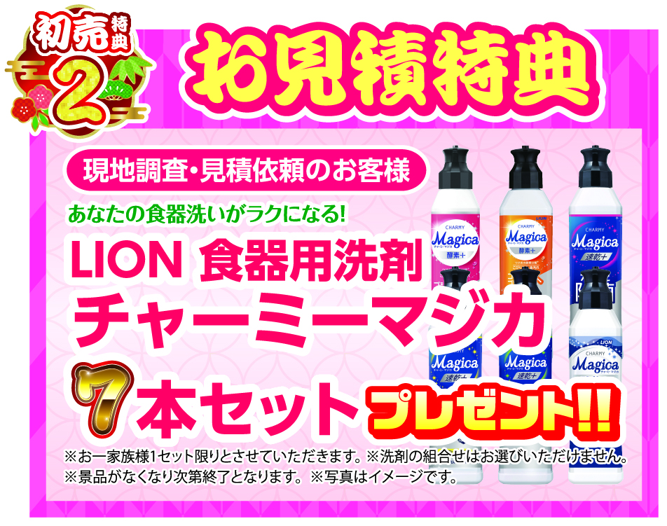 特典2 現地調査・見積依頼のお客様限定! LION 食器用洗剤「チャーミーマジカ」7本セット プレゼント!