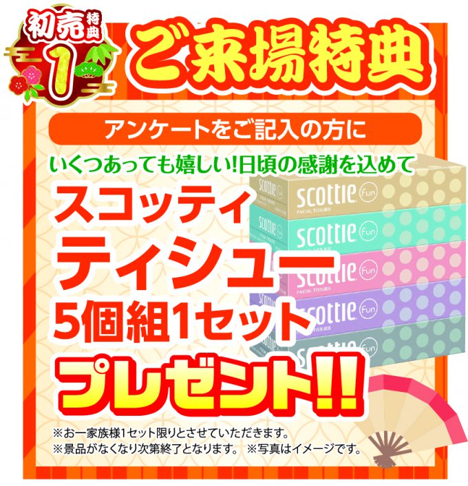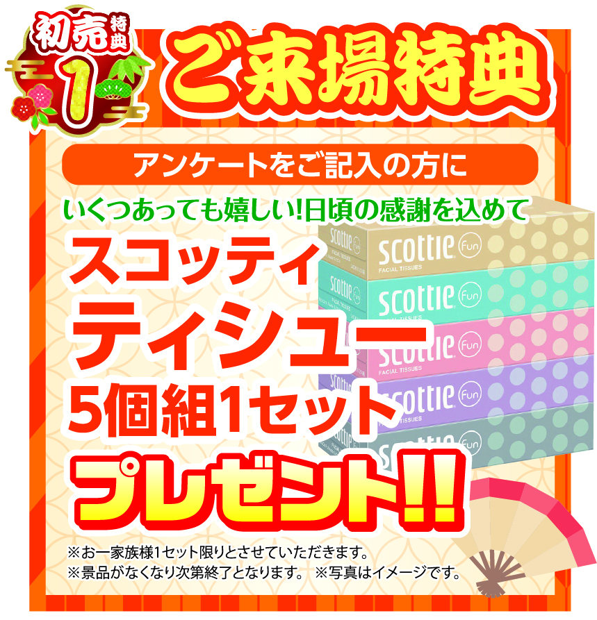 特典1 ご来場特典 アンケートをご記入の方に スコッティティッシュー5個組1セット プレゼント!