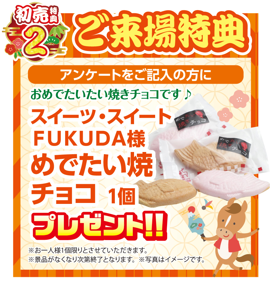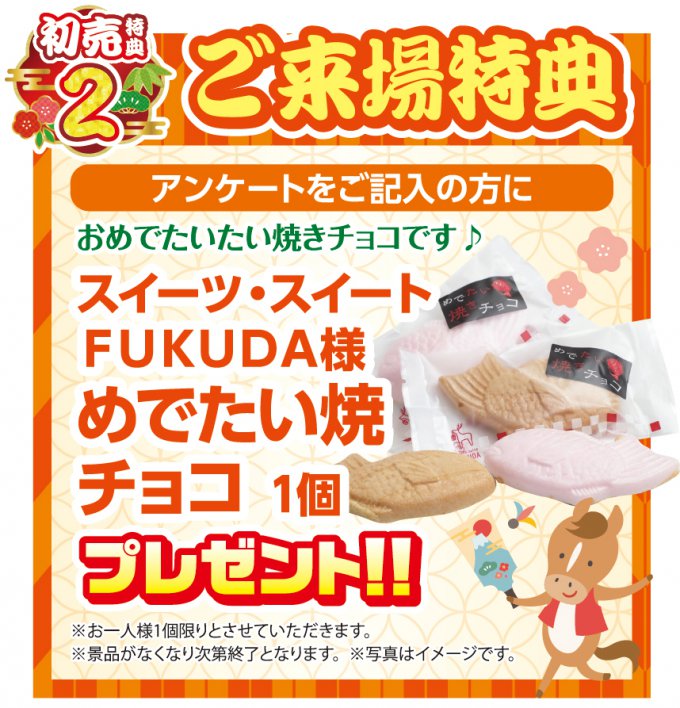 特典2 ご来場特典 アンケートをお答えの方に スイーツ・スイートFUKUDA様 めでたい焼チョコ1個 プレゼント!