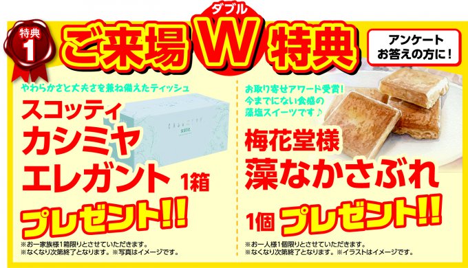 特典1 ご来場特典 アンケートをご記入の方に スコッティ「カシミヤエレガント」1箱&梅花堂様「藻なかさぶれ」1個プレゼント!