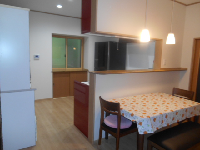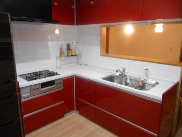 奥様こだわりのキッチンを入れました。赤いキッチンが空間に映え、とても素敵な仕上がりにできました。