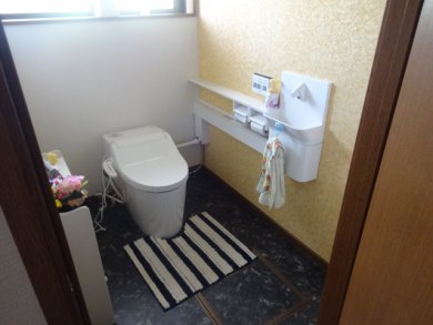 トイレはきれいになっただけでなく、節水も期待できます。また、内装をガラッと変えたことで印象がだいぶ変わり、側面のアクセントクロスが映える仕上がりとなりました。