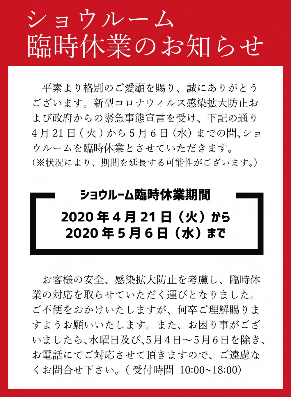 ショウルームを臨時休業と