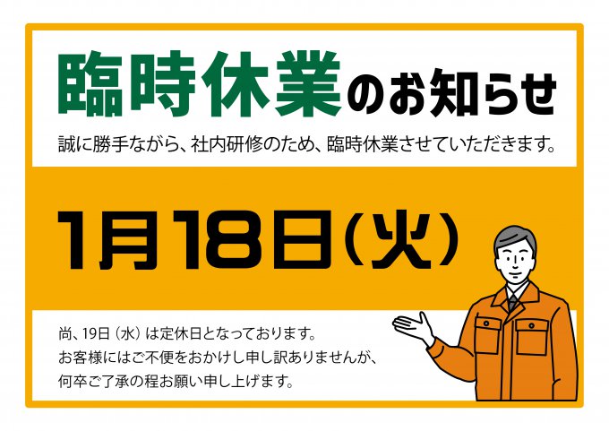 社内研修のため、臨時休業させていただきます。