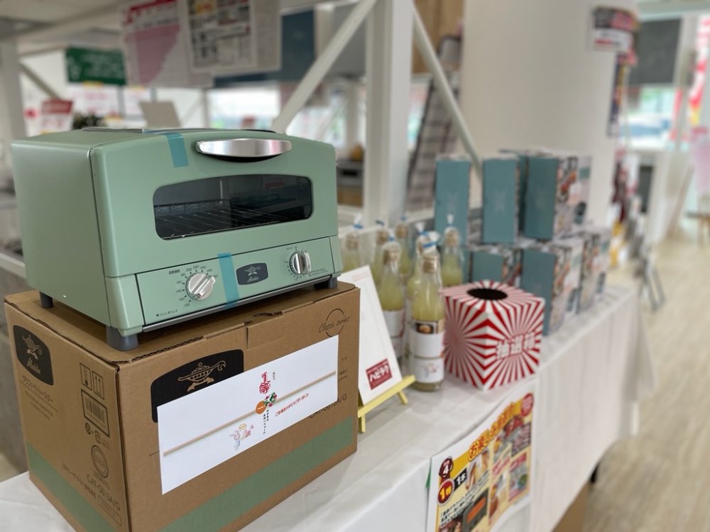 特典4 お楽しみ抽選会:1等・アラジングラファイトグリル&トースター(2枚焼き)/1本 2等・宮崎牛バラ焼き肉用/3本 3等・梨ジュース/8本 ・参加賞・ザル付き新鮮保存容器1個