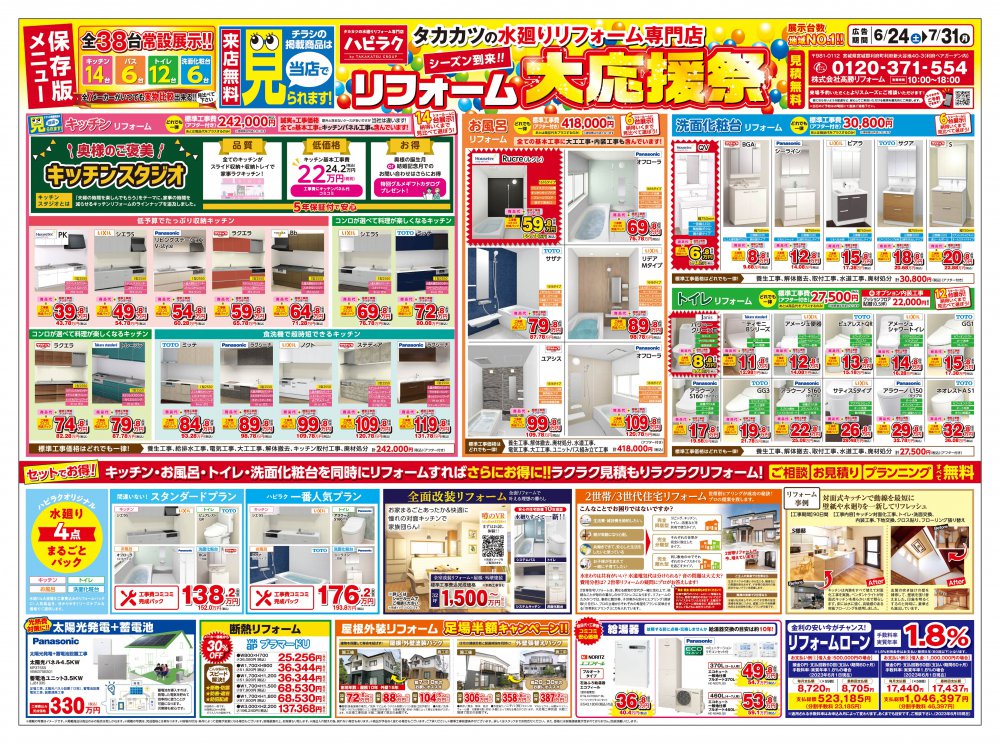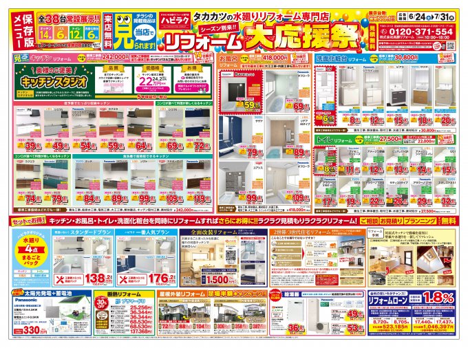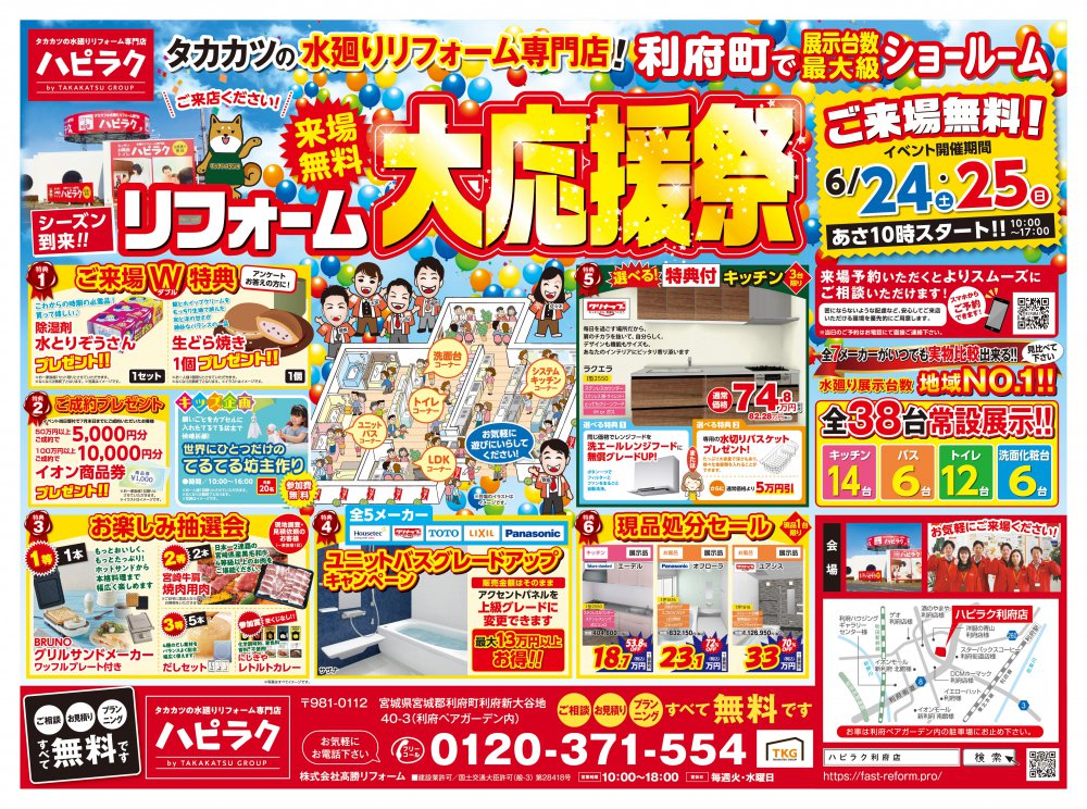 タカカツの水廻りリフォーム専門店 ハピラク利府店では6/24(土)・25(日)の2日間で「リフォーム大応援祭」を開催いたします。イベントならではの特典が盛りだくさん!ぜひお気軽にご来場ください!