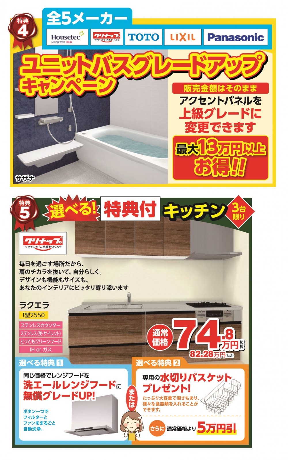 特典4 ユニットバスグレードアップキャンペーン:ハウステック・クリナップ・TOTO・リクシル・パナソニック各種 販売金額はそのまま アクセントパネルを上級グレードに変更できます!最大13万円以上お得!!
