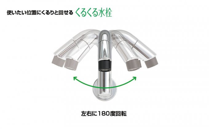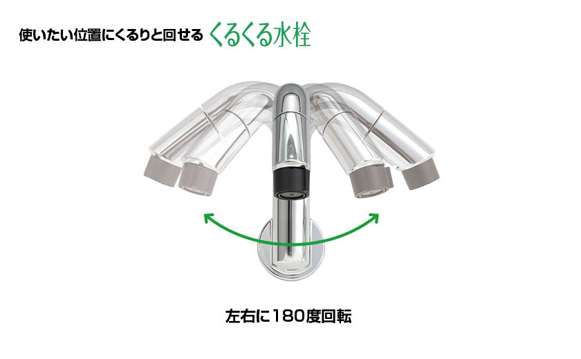POINT②【くるくる水栓】左右に180度回転するので、使いたい位置にくるりと回せます。
