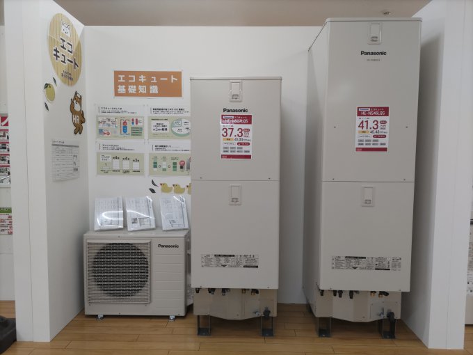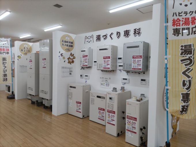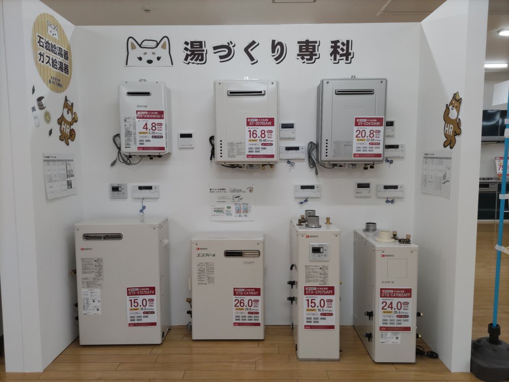 ガス給湯器3台、石油給湯4台、エコキュート2台を展示しております。