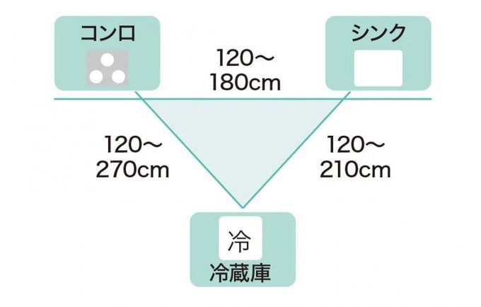 シンク・コンロ・冷蔵庫を結んでできる三角形「ワークトライアングル」。